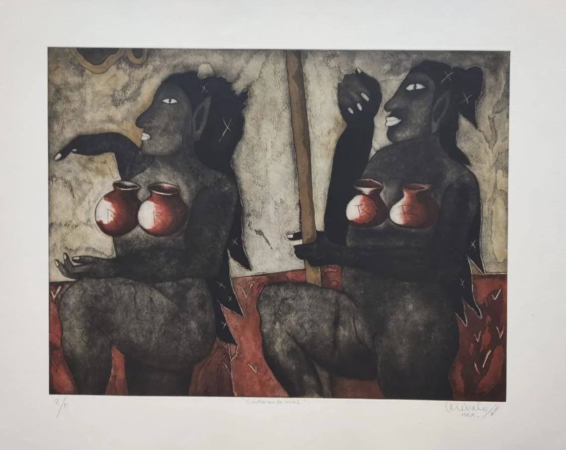 Arévalo, one of Mexico’s most important graphic artists, delivers a masterclass in printmaking with Cántaros de miel. Through aquatint and etching, the composition evokes both myth and memory, drawing the viewer into an almost dreamlike state. This certified print combines craftsmanship and storytelling, making it a distinguished addition to any collection.